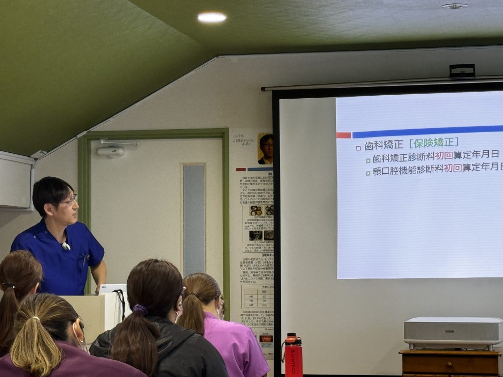 スタッフ研修会(定例) 歯科衛生士 藤川 「症例」 歯科衛生士 青木 抄読「MFTアップデート」 歯科医師 藤村「保険矯正入力について」 の話がありました。 2024年12月13日(金) 【前へ】シェルクレールオンラインセミナーにて歯科衛生士 青木が講演しました。 【次へ】あさひ保育園へ歯科衛生士 栗原が歯磨き指導に行きました。 活動報告一覧